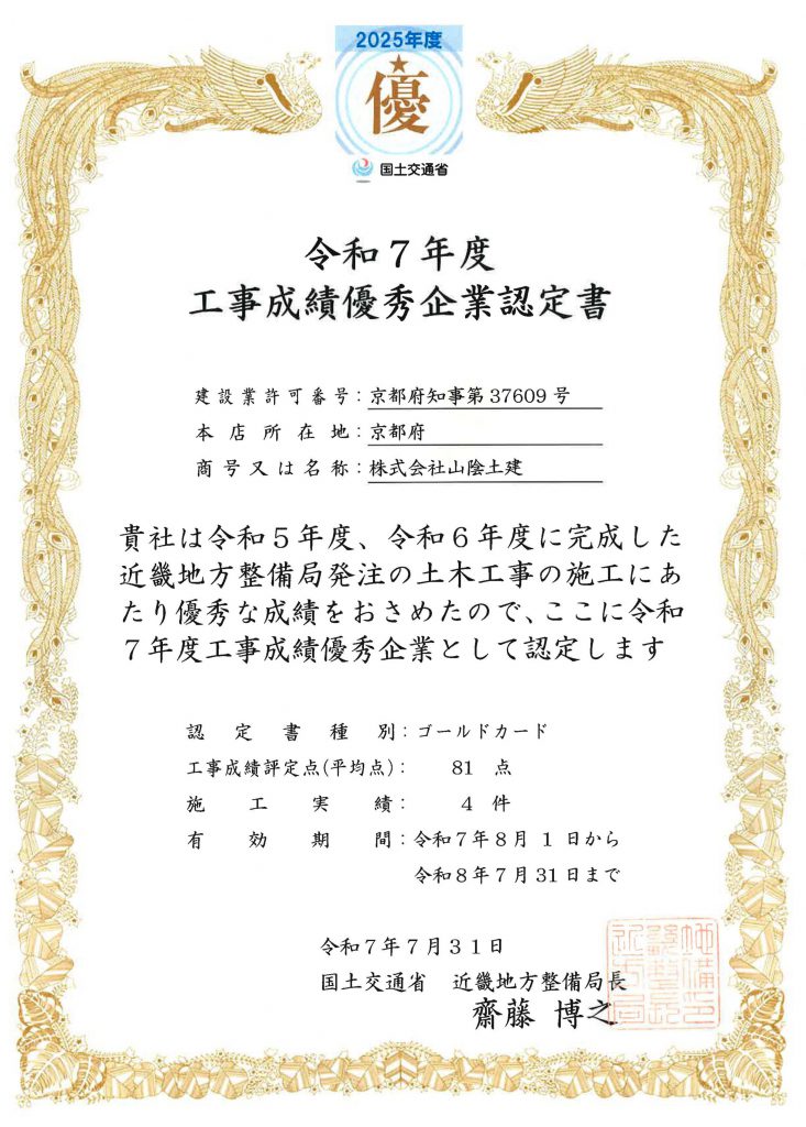 このたび、当社は近畿地方整備局より『工事成績優秀企業』として認定されました。 これは日々の施工品質の取り組みや、安全管理・技術力が評価されたものです。 これからも、地域の皆さまに安心と信頼を届けられる施工を目指し、より一層努力してまいります。
